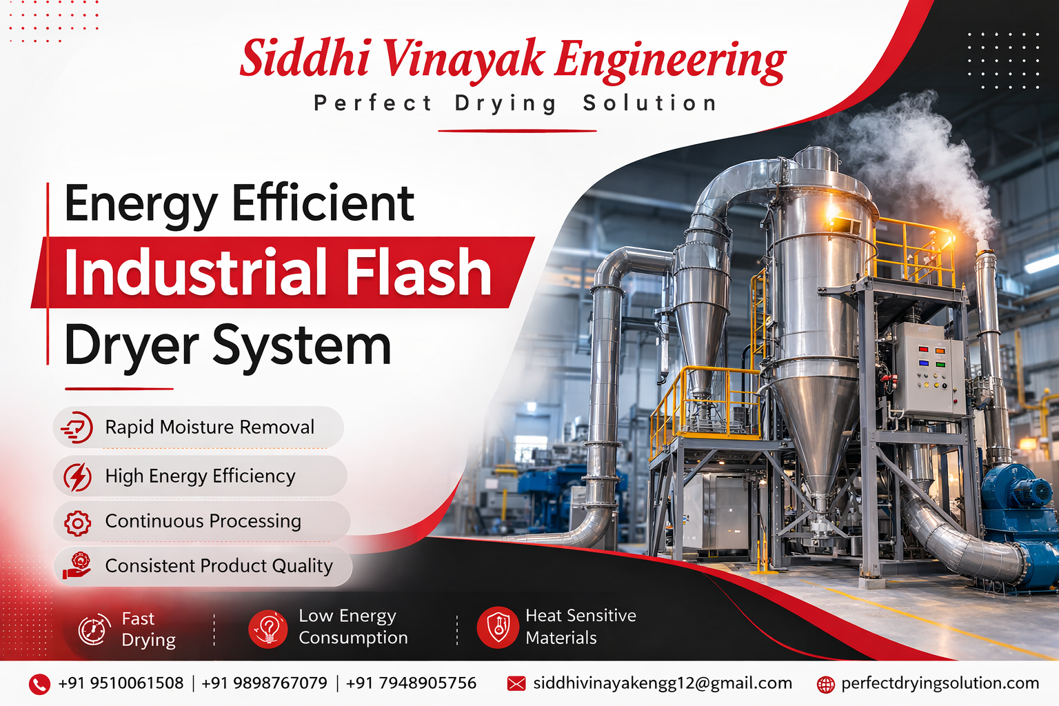 An energy efficient industrial flash dryer system operates by rapidly dispersing wet material into a stream of heated air inside a drying chamber. The moisture contained in the material evaporates almost instantly due to the combination of high temperature and high airflow velocity, producing dry particles that are separated through cyclones or collection systems.