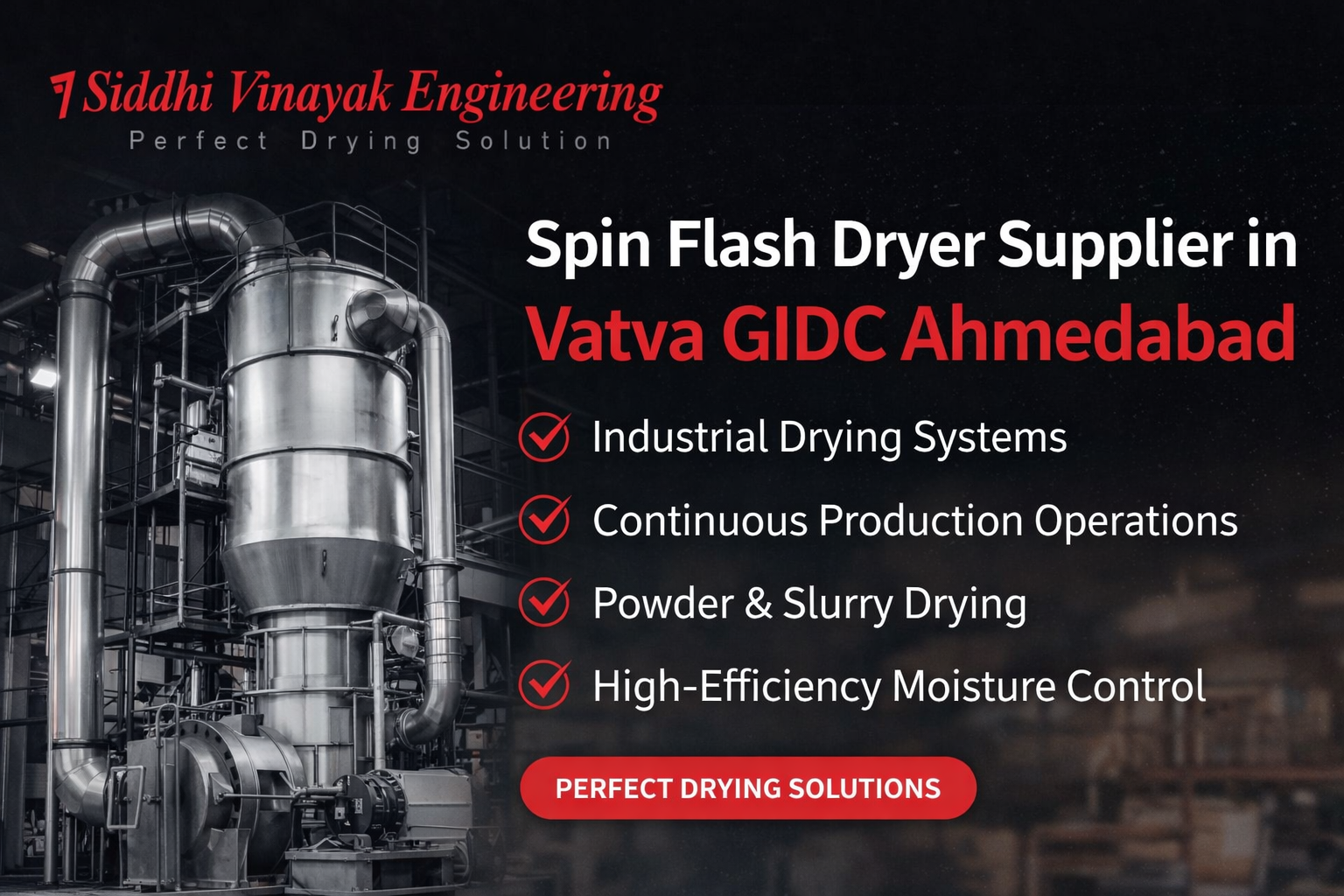 Siddhi Vinayak Engineering is located in Phase I, GIDC Vatva, Ahmedabad. The company manufactures and supplies industrial drying and evaporation systems, including spray dryers, flash dryers, spin flash dryers, evaporators, fluid bed dryers, hot air generators, and related process equipment. Operating from one of Gujarat's key industrial zones, the company serves manufacturing units that require process-integrated and performance-oriented drying systems.