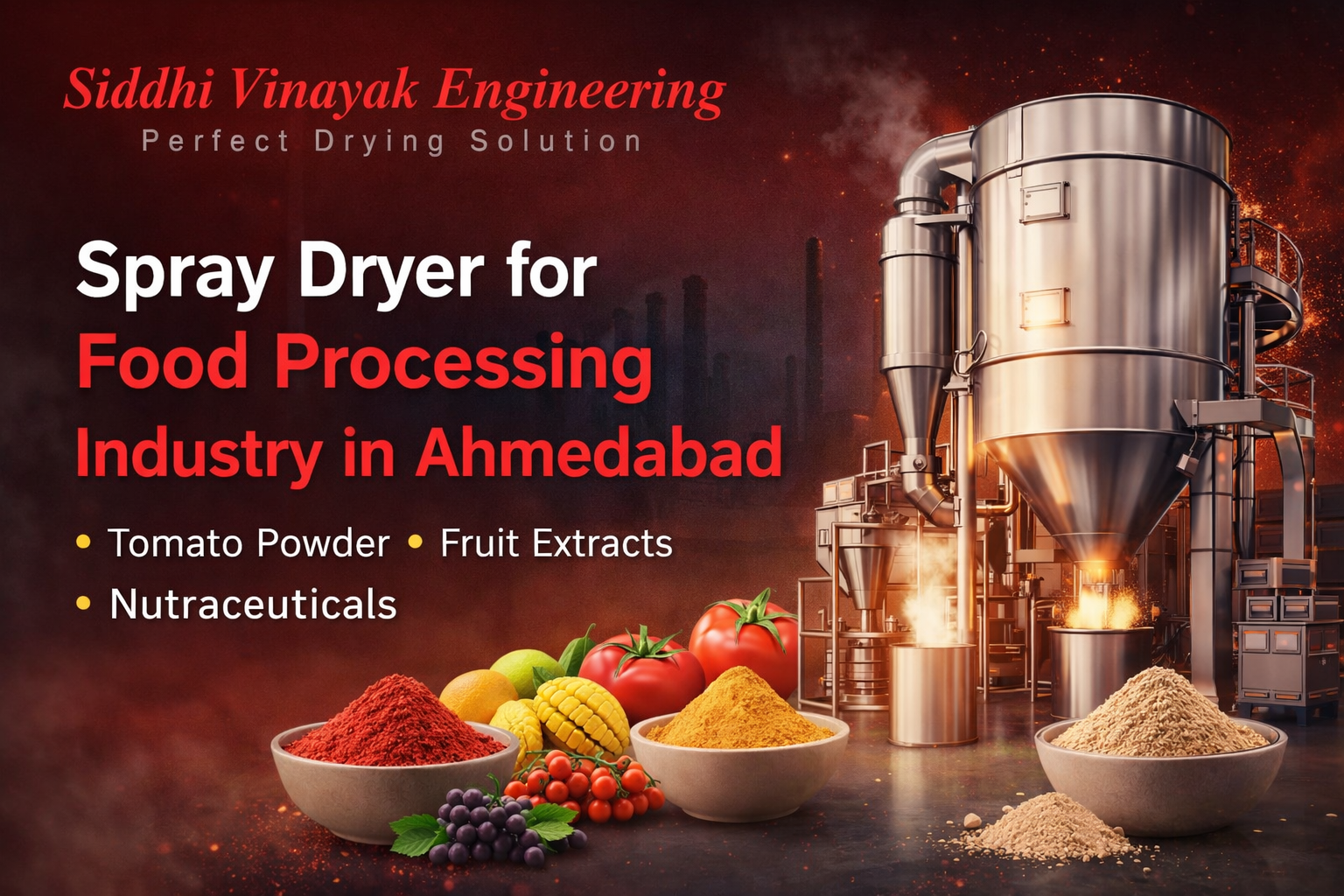 Siddhi Vinayak Engineering, located in GIDC Vatva, Ahmedabad, manufactures industrial spray dryers and associated drying systems used across food and agro-processing sectors. The company designs equipment such as spray dryers, flash dryers, spin flash dryers, fluid bed dryers, evaporators, hot air generators, and integrated drying systems. These systems are engineered to process various food-based liquid feeds, including fruit pulp, vegetable extracts, dairy solutions, and nutraceutical formulations.
